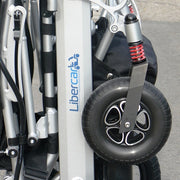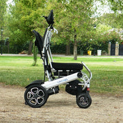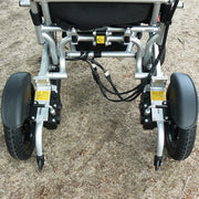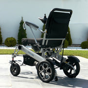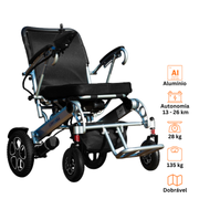 Cadeira de rodas elétrica dobrável ultraleve com estrutura de alumínio e bateria de lítio removível. Peso total de apenas 28 kg sem a bateria.