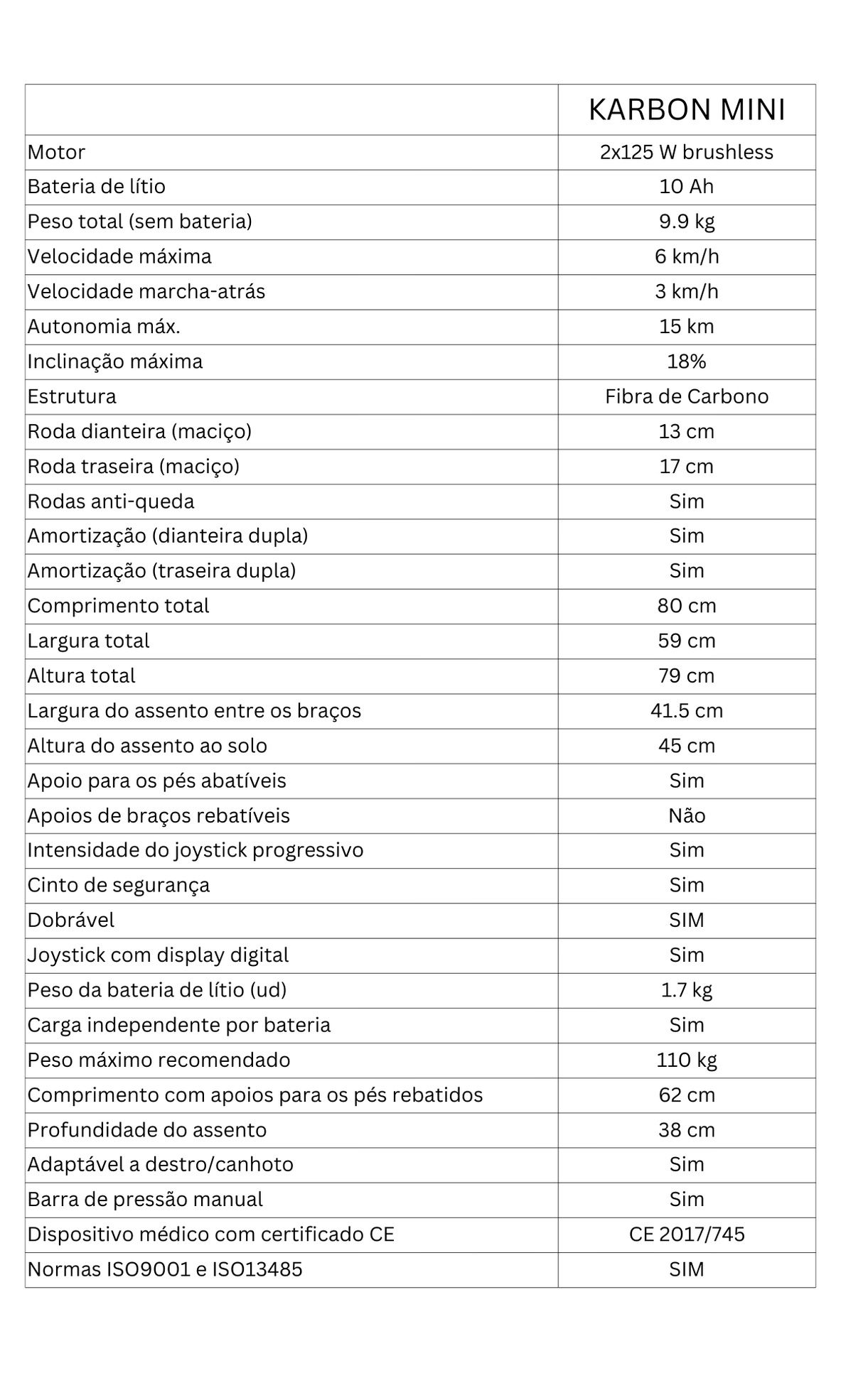 - Cadeira elétrica ultraleve com chassis em fibra de carbono, pesando apenas 9,9 kg. Este material é duas vezes mais leve que o alumínio e, ao mesmo tempo, cinco vezes mais resistente que o aço.
