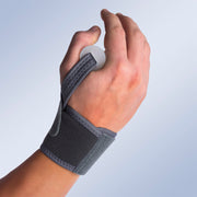- Fabricado em material elástico e transpirável, composto por uma cinta que permite ajustar a compressão e tração exercida sobre o polegar de acordo com as necessidades de cada paciente, esta cinta também permite a estabilização elástica e abdução da articulação do metacarpo na zona do polegar.