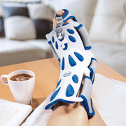 O Body Armor® Night Splint é usado à noite para aliviar facilmente o desconforto da fascite plantar durante o sono. As tiras de gancho e loop macias facilitam a colocação rápida e garantem um ajuste confortável da tala noturna. O anel de borracha pode ser usado para fixar o loop ou a placa dos dedos em diferentes posições.