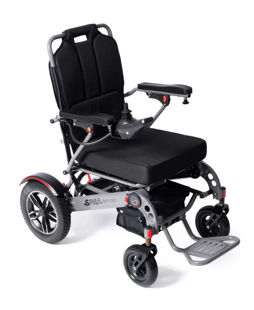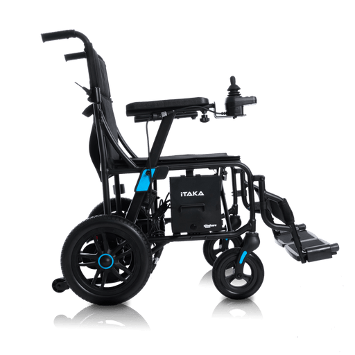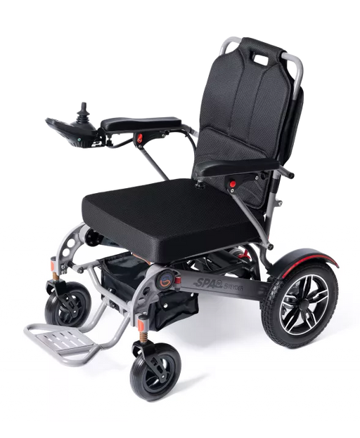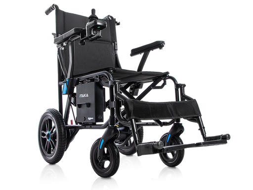 Silla de ruedas eléctrica y plegable, con estructura de aluminio y batería de litio con un moderno y práctico sistema de cierre eléctrico de la si...