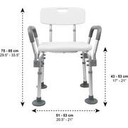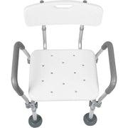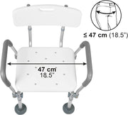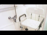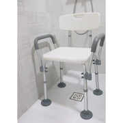 Silla de baño con reposabrazos, adecuada para sentarse en la bañera o ducha y para facilitar las actividades de higiene a usuarios con dificultades de movilidad.