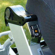 - Dobra-se num instante: reclina o apoio de braços, o encosto e o apoio de pés. O mecanismo foi melhorado para uma dobragem mais eficaz. Depois, dobra todo o corpo da cadeira com um gesto simples. Pode, então, coloca-a na mala do carro ou guarda-a num armário, pois o seu comprimento dobrado é de apenas 40 cm.