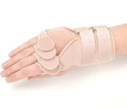 Ortótese passiva para punho, mão e dedos, feita de veludo espumado.